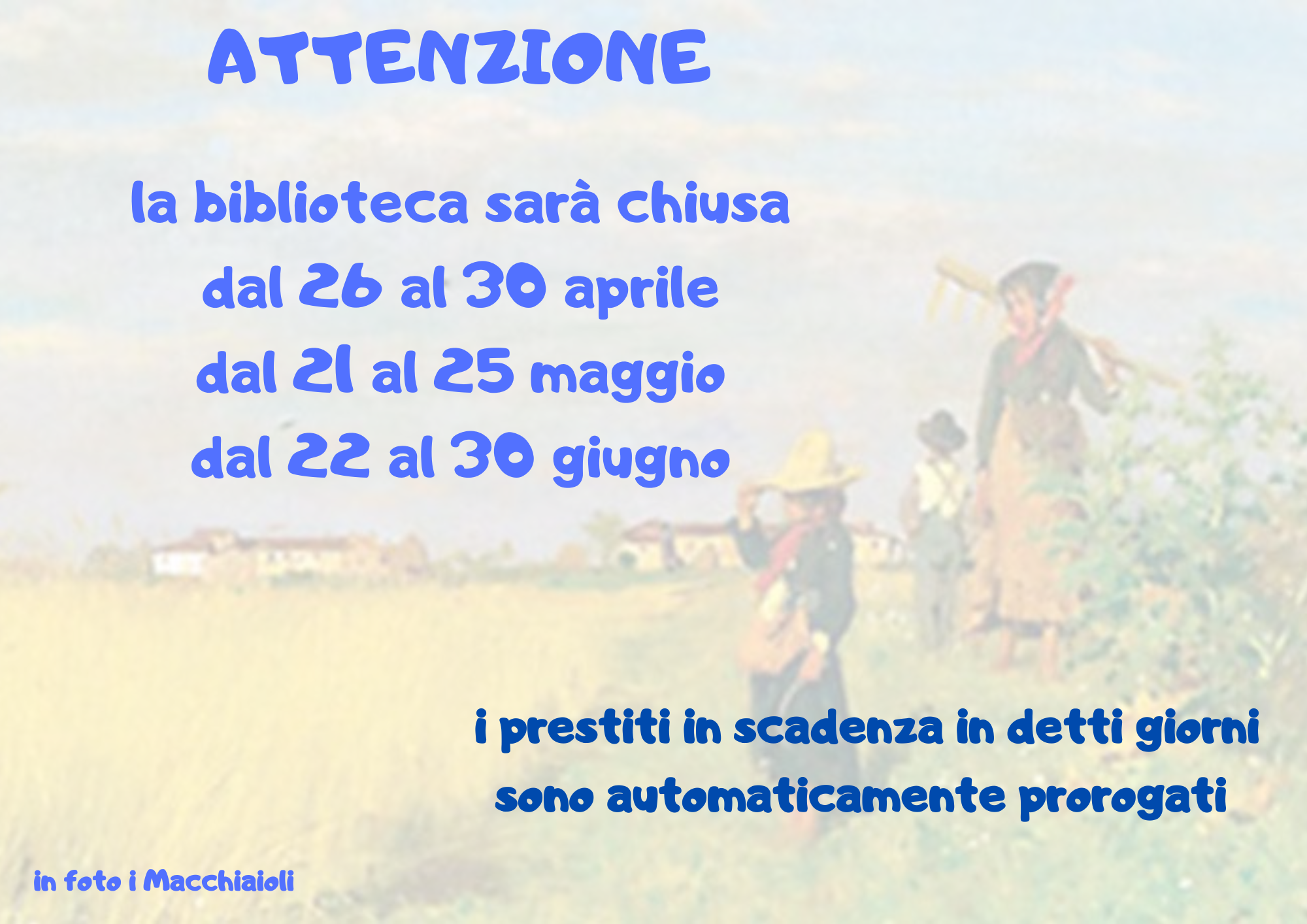 Si avvisano gli utenti che la biblioteca sarà chiusa in tre periodi separati alla fine dei mesi di Aprile Maggio e Giugno