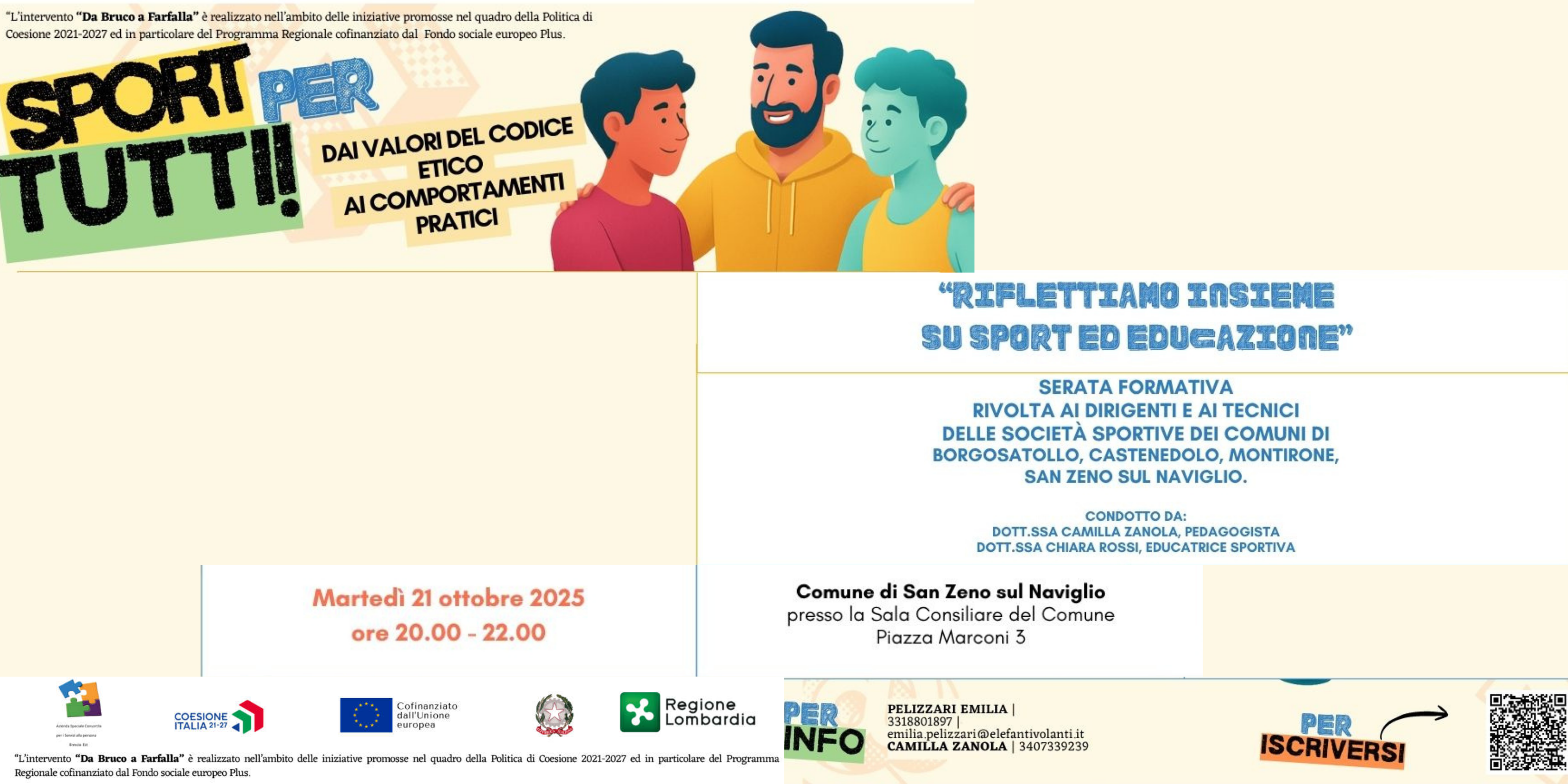 Martedì 21 ottobre 2025, dalle ore 20:00 alle 22:00, presso la Sala Consiliare del Comune di San Zeno Naviglio (Piazza Marconi 3), si terrà la serata formativa “ Riflessiamo insieme su sport ed educazione ”.