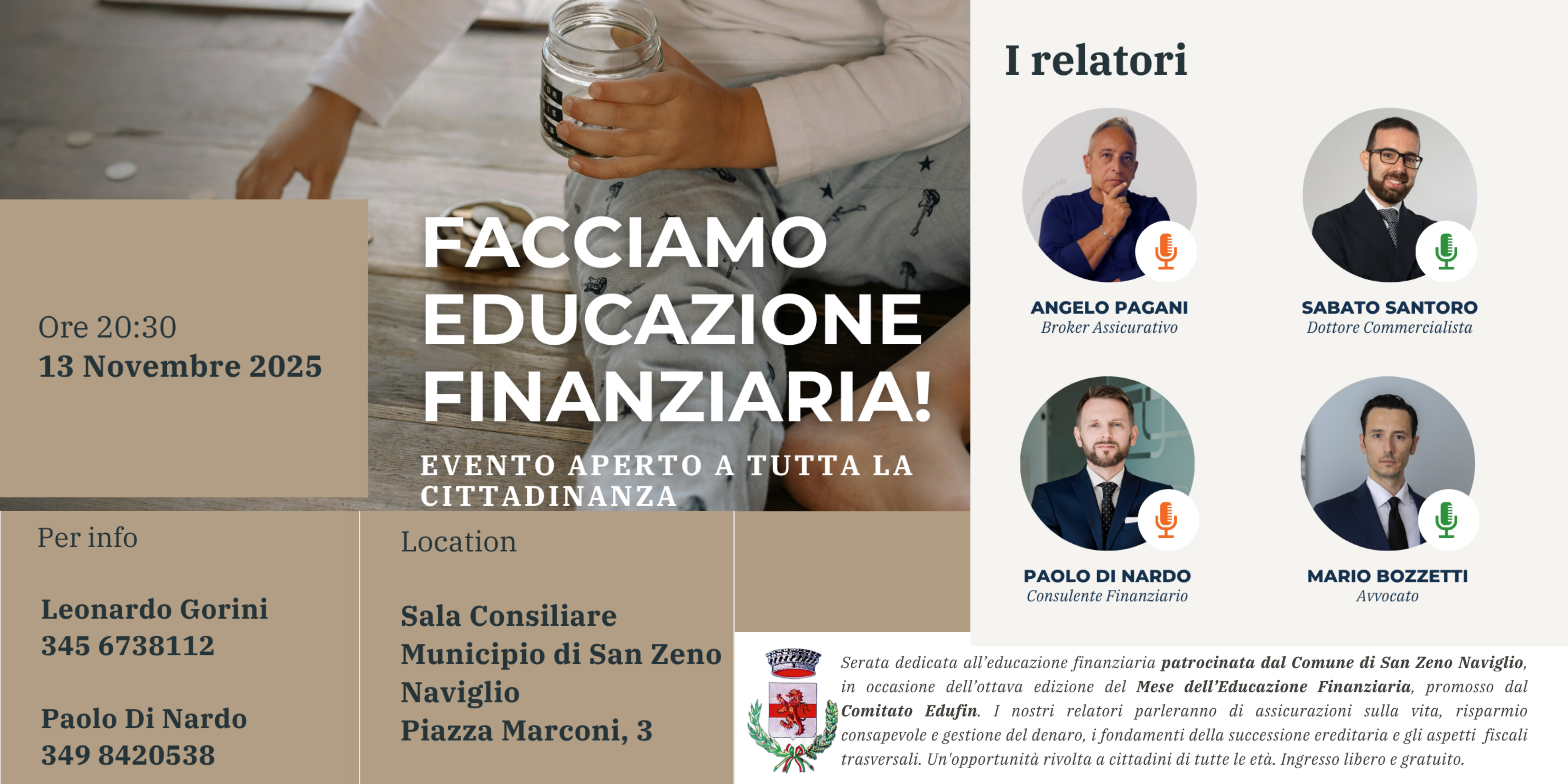 Il Comune di San Zeno Naviglio è lieto di ospitare “Facciamo Educazione Finanziaria!” , un evento gratuito e aperto a tutta la cittadinanza che si terrà giovedì 13 novembre 2025 alle ore 20:30 presso la Sala Consiliare del Municipio (Piazza Marconi, 3) .