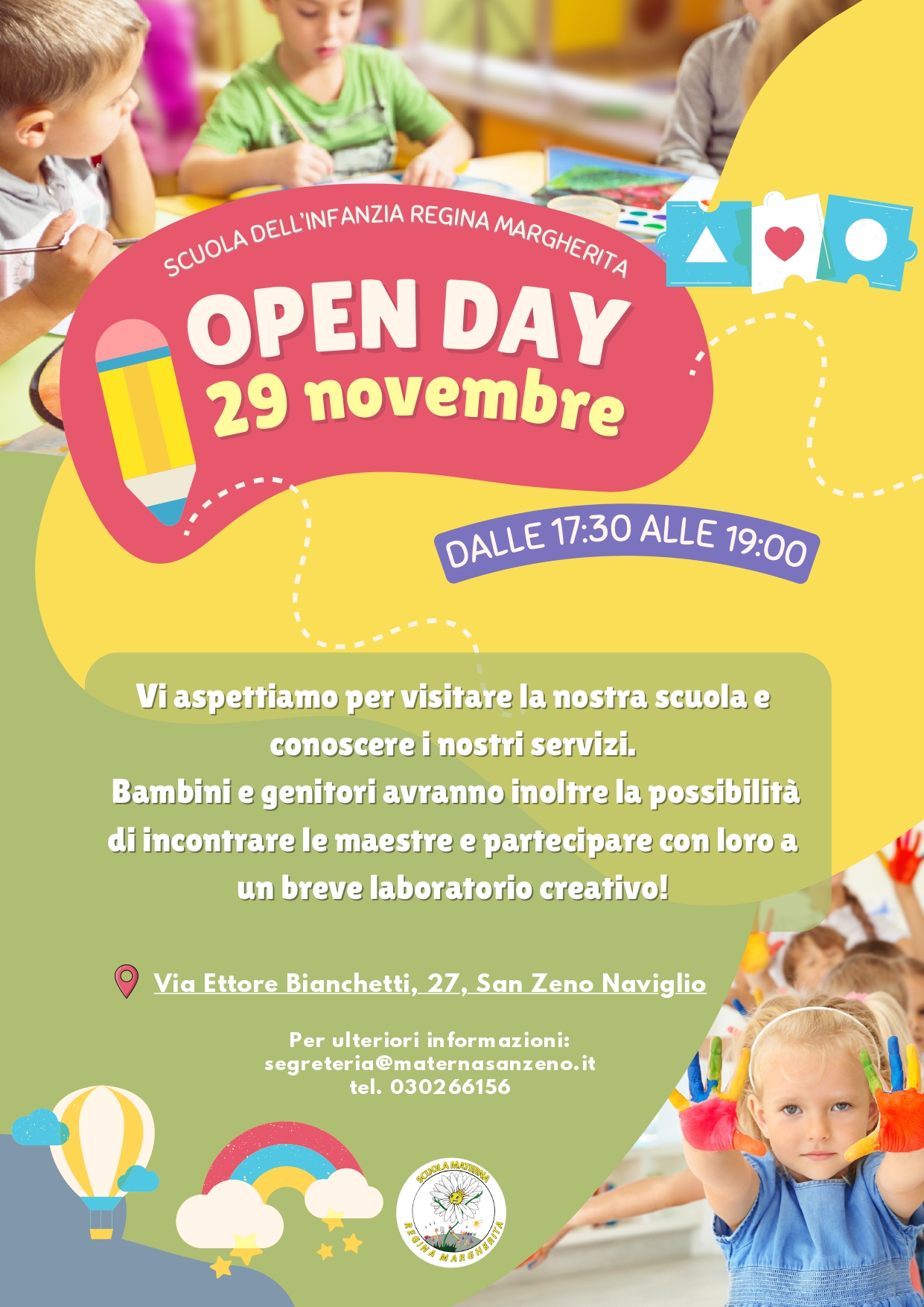 Sabato 29 novembre si terrà un open day presso la scuola dell'infanzia Regina Margherita, dalle ore 17.30 alle ore 19.00.